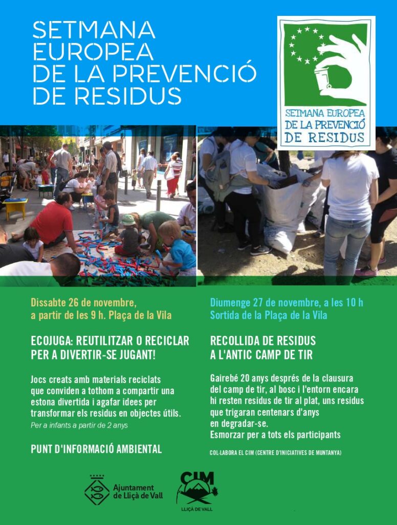 El cap de setmana del 26 i 27 de novembre celebrem a Lliçà la Setmana Europea de la prevenció de residus. Un grup d’alumnat de 4t d’ESO que realitza el Servei Comunitari “Agents cívics pel mediambient” ja fa dies que treballen per fer de Lliçà un municipi més sostenible fent difusió de la campanya municipal per a la recollida selectiva. Han fet un porta a porta repartint un futlletó informatiu i el dissabte 26 de novembre els podreu trobar a la Plaça de la Vila participant de les activitats previstes i fent d’agents ambientals en el punt d’informació municipal.