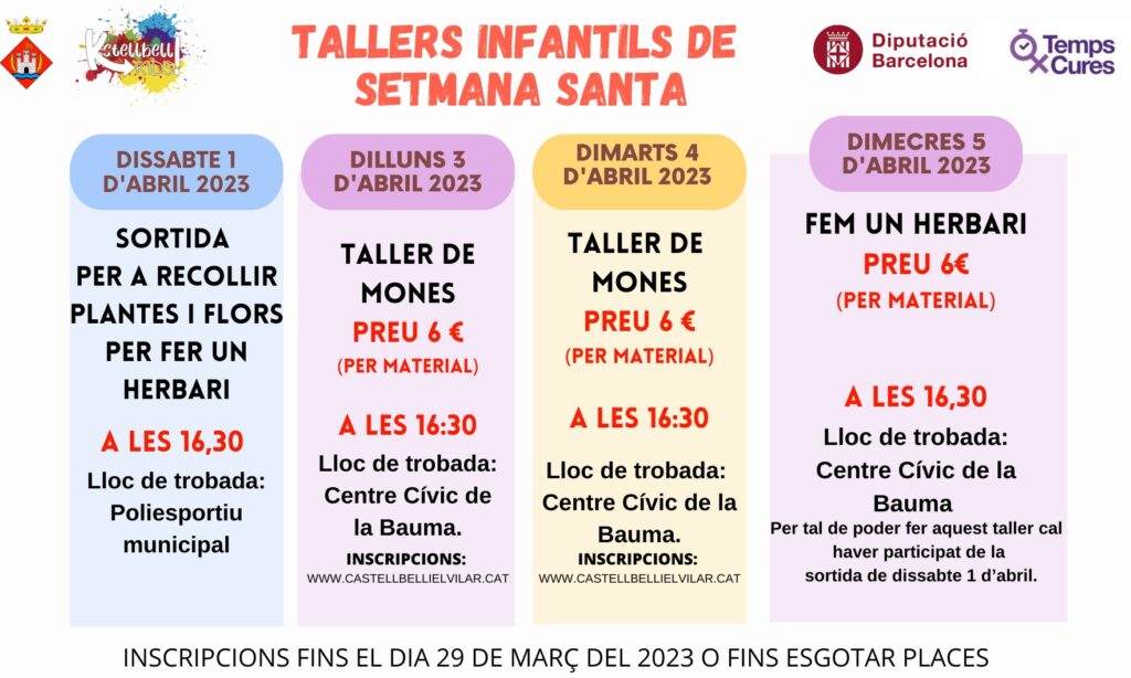 L’Ajuntament de Castellbell i el Vilar programa una oferta de tallers infantils coincidint amb Setmana Santa. Les activitats començaran el primer dissabte d’abril amb una sortida per recollir plantes i flors per fer un herbari. Els dos tallers en què s’explicarà com fer una mona de Pasqua i un herbari es faran els dies 3, 4 i 5 d’abril a partir de les 16.30 hores al Centre Cívic La Bauma.
