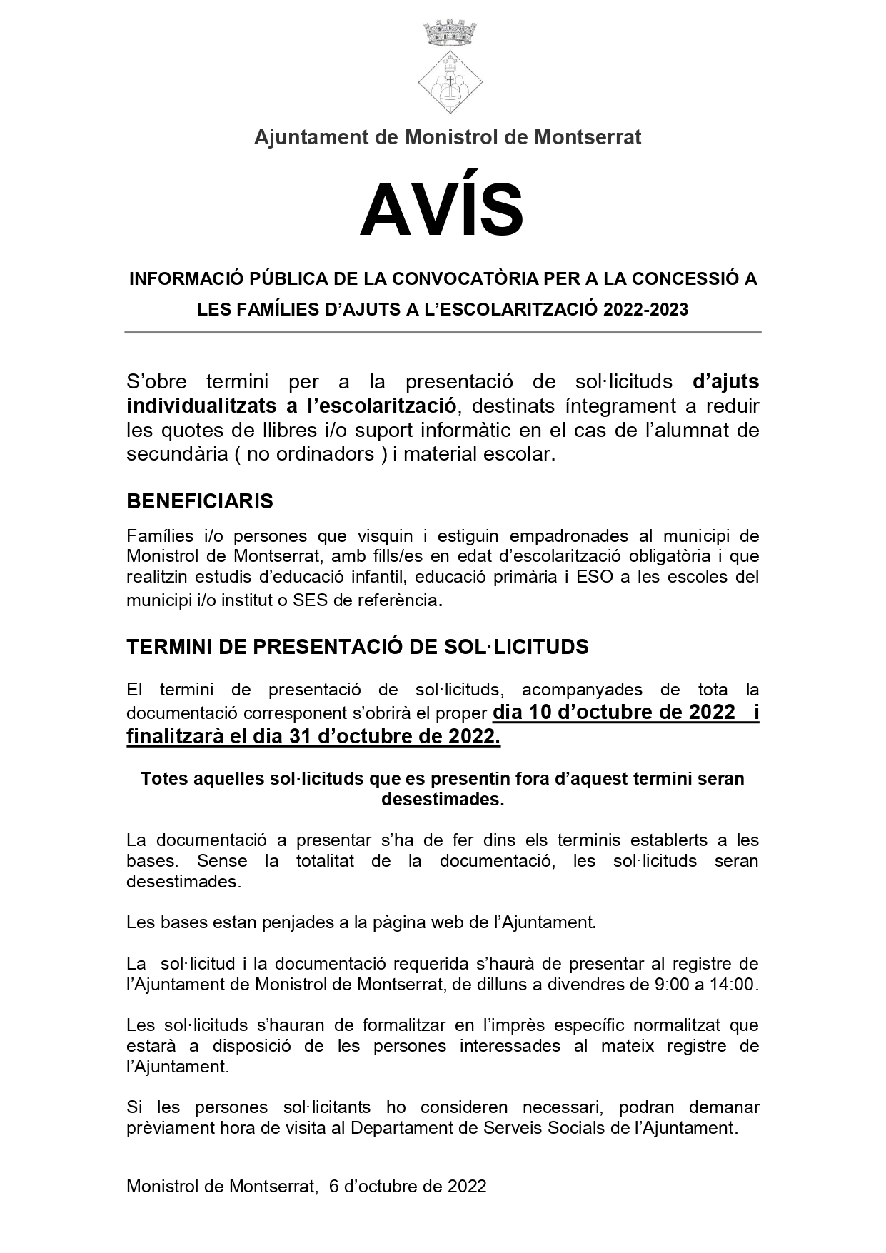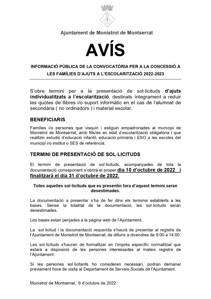 Us comuniquem que des de l’Ajuntament de Monistrol de Montserrat, el  proper dilluns dia 10 d’octubre de 2022,  s’obrirà la  convocatòria per les Ajudes a l’Escolarització en concepte de llibres i/o suport informàtic: llicències, etc. (en el cas de secundària ) i material escolar. La convocatòria per presentar les sol·licituds estarà oberta des del dilluns dia 10 d’octubre fins el  dilluns dia 31 d’octubre, ambdós inclosos.