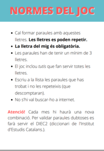 Així, inspirant-nos en el joc creat per RodaMots, cada mes es presentarà una combinació de paraules, igual a cada classe, i l’alumnat haurà de buscar el nombre més gran de paraules possibles. Cada mes es farà el recompte de paraules per classe i es confeccionarà una classificació.🗓️