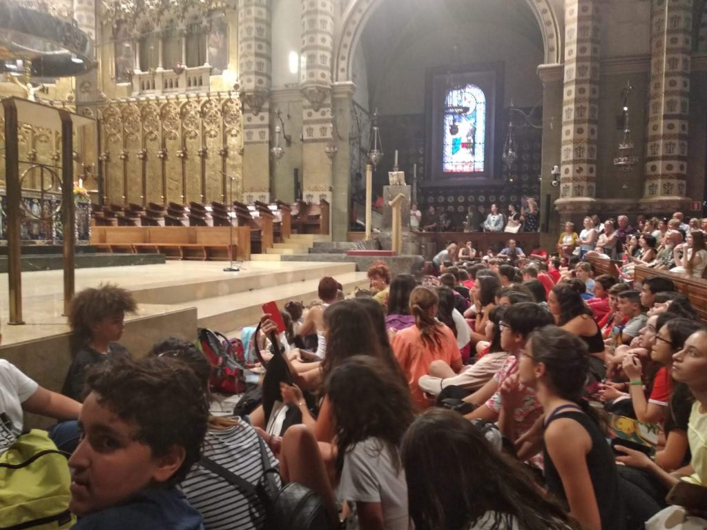 Un cop han sortit del museu, han anat a l’escolania, on els esperaven quatre escolans, en Josep, l’Arnau, en Joan i l’Oriol. Han fet un recorregut per l’escolania (habitacions, les aules, la zona de jocs, zona dels àpats…). Ràpidament, i sense tenir temps a conversar gaire amb ells, han entrat a l’església, per escoltar-los cantar La Salve i el Virolai.