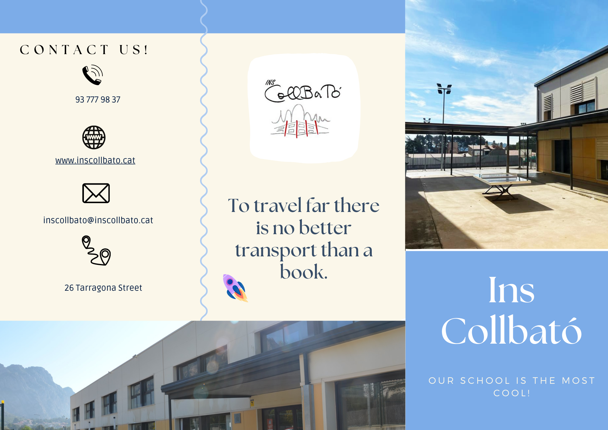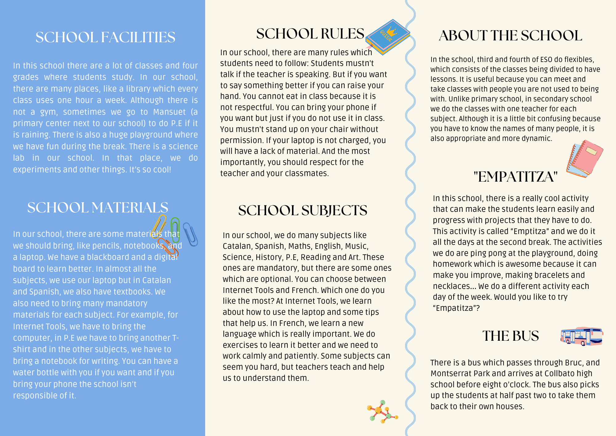 En aquest tríptic els alumnes no només han après, sinó que han posat en pràctica els conceptes treballats a l’aula com: there is/are, must/mustn’t, can/can’t i el vocabulari relacionat amb l’escola.