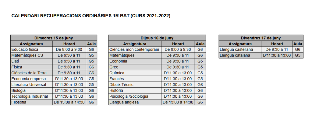 Calendari recuperacions ordinàries 1r Batxillerat Ramon Paraíso02/06/22 S’adjunta el calendari de recuperacions ordinàries de primer de batxillerat per als propers dies 15, 16 i 17 de juny. Per a qualsevol consulta caldrà contactar amb el professorat corresponent.