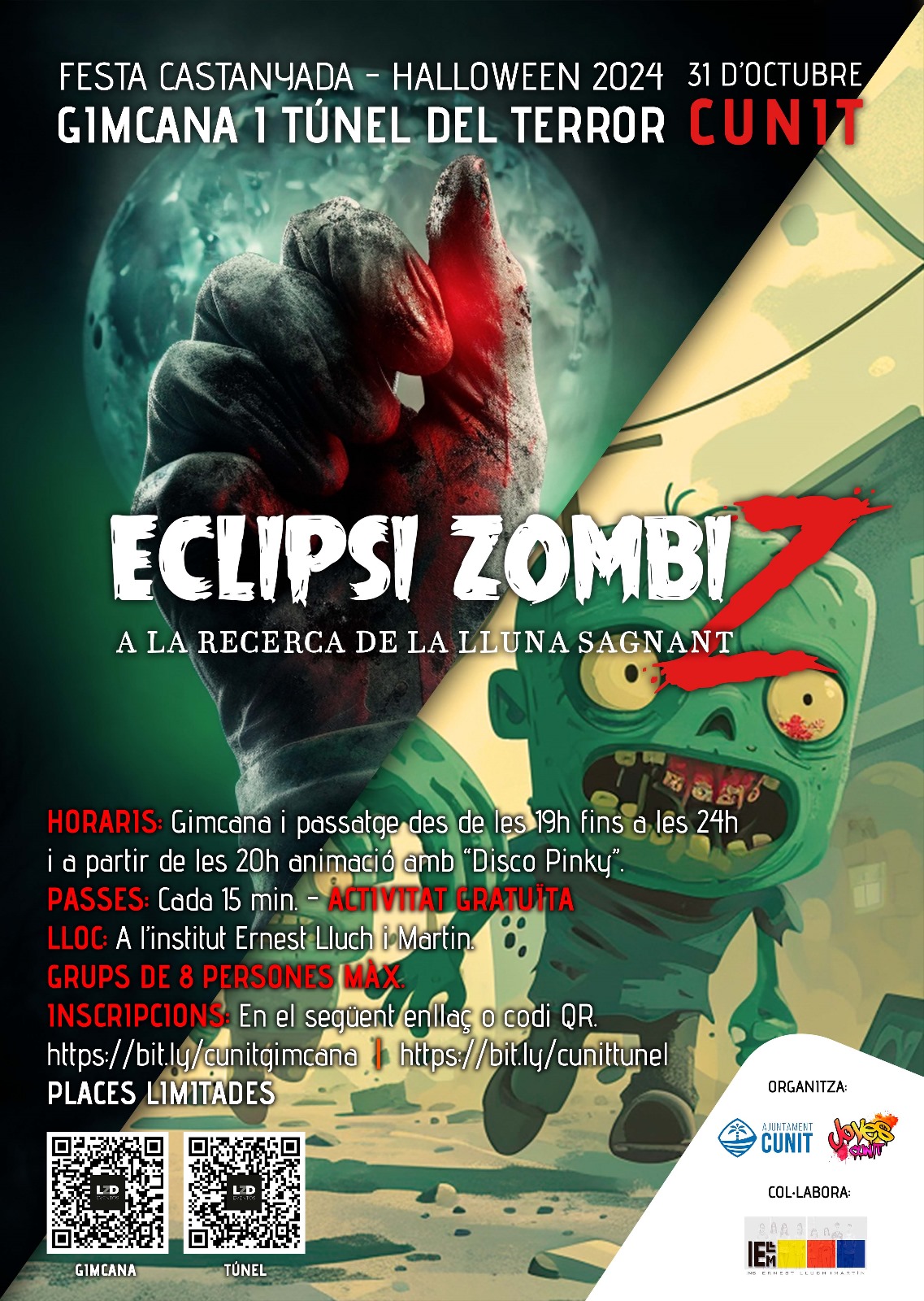 Enguany comptarem amb dues activitats. Per una banda, podreu entrar al mític i aterridor Túnel del Terror, una experiència plena de por i tensió, reservada als més valents. D’altra banda, us convidem a participar en la Gimcana Zombi, on haureu de resoldre misteris i superar proves mentre us enfronteu a una invasió de zombis.
