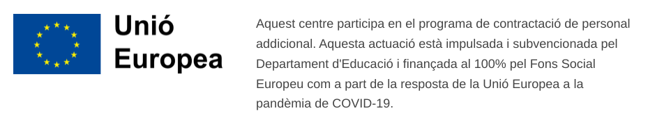 Segurament heu notat que a la part inferior de la nostra pàgina web tenim el logo de la Comunitat Europea amb un text sobre professors de reforç. Efectivament, durant aquests dos darrers cursos marcats per la pandèmia, ens hem beneficiat d’unes dotacions extres de professorat gestionades a través del Departament d’Educació i amb el finançament del Fons Social Europeu. Aquest professorat ens ha permès de tenir dos docents per aula en algunes matèries. Esperem que això hagi estat beneficiós per als nostres alumnes.