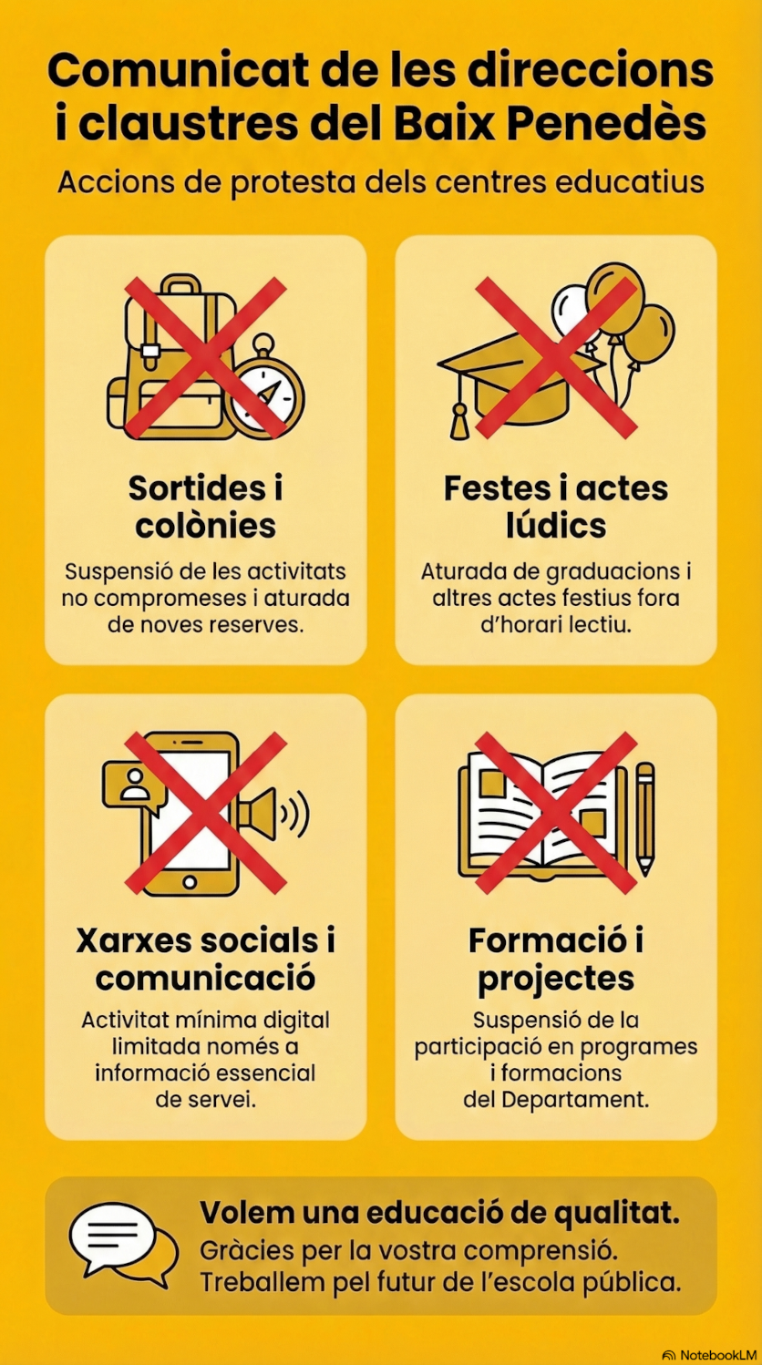 Com a direccions de centre, repetim que mantenim el nostre compromís amb l’alumnat i amb les seves famílies, treballant cada dia per oferir una educació pública de qualitat, equitativa i al servei de tothom. Alhora, entenem que aquest compromís ha de ser compartit: només amb els suports, recursos i condicions adequades podrem garantir que les escoles i instituts públics continuïn desenvolupant amb qualitat la seva funció educativa i social.