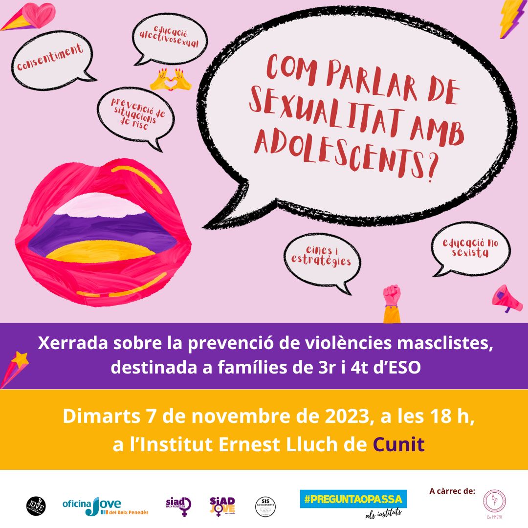 El proper 7 de novembre l’Institut, conjuntament amb l’Oficina Jove del Baix Penedès, ha organitzat una xerrada orientada a les famílies de l’alumnat del centre sobre la prevenció de violències masclistes. L’objectiu és acompanyar l’alumnat i el seu entorn més proper en la prevenció de situacions de risc i en l’adquisició d’eines per una educació afectivosexual de qualitat. L’activitat estarà oberta al públic i a les famílies de tots els nivells acadèmics del centre i es durà a terme a la cantina de l’institut a les 18 hores. Us hi esperem!