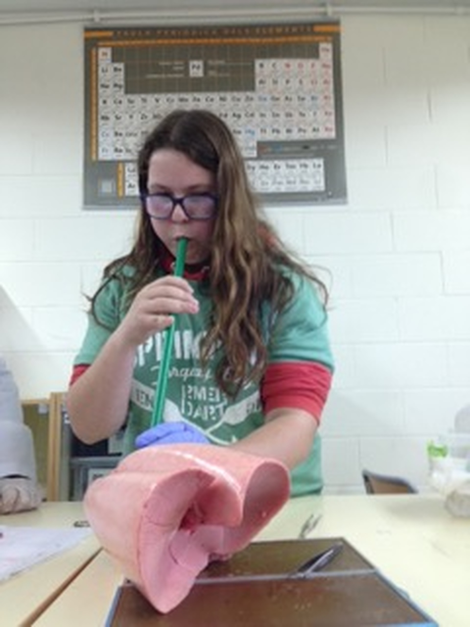 Els alumnes de 3r d’ESO disseccionen un pulmó de be per estudiar l’anatomia de l’aparell respiratori. Han pogut observar la tràquea, els bronquis i els bronquíols.