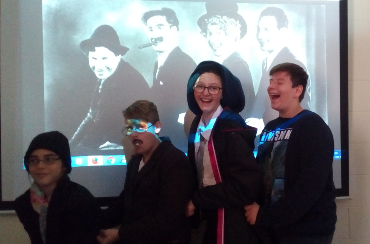Després de llegir una lectura sobre cinema antic a l’hora de català, un grup d’alumnes de 2n d’ESO hem volgut imitar una fotografia dels Germans Marx. El Germans Marx (Chico, Harpo, Groucho i Zeppo) van ser uns actors de cinema còmic dels anys trenta (1930). Algunes de les seves pel·lícules més conegudes són: Una nit a l’òpera (1933) i Un dia a les curses (1937). Us les recomanem. Són molt divertides.