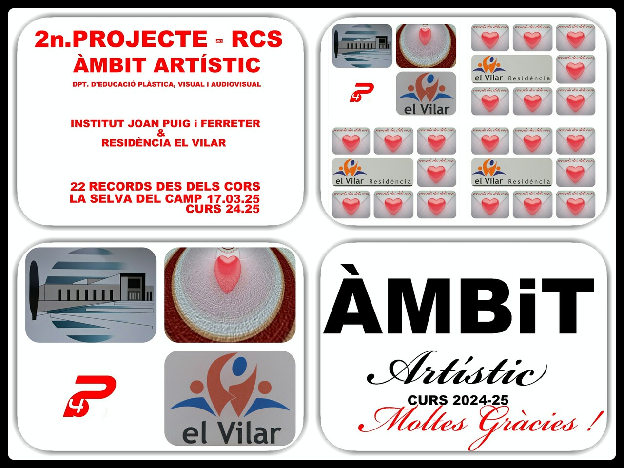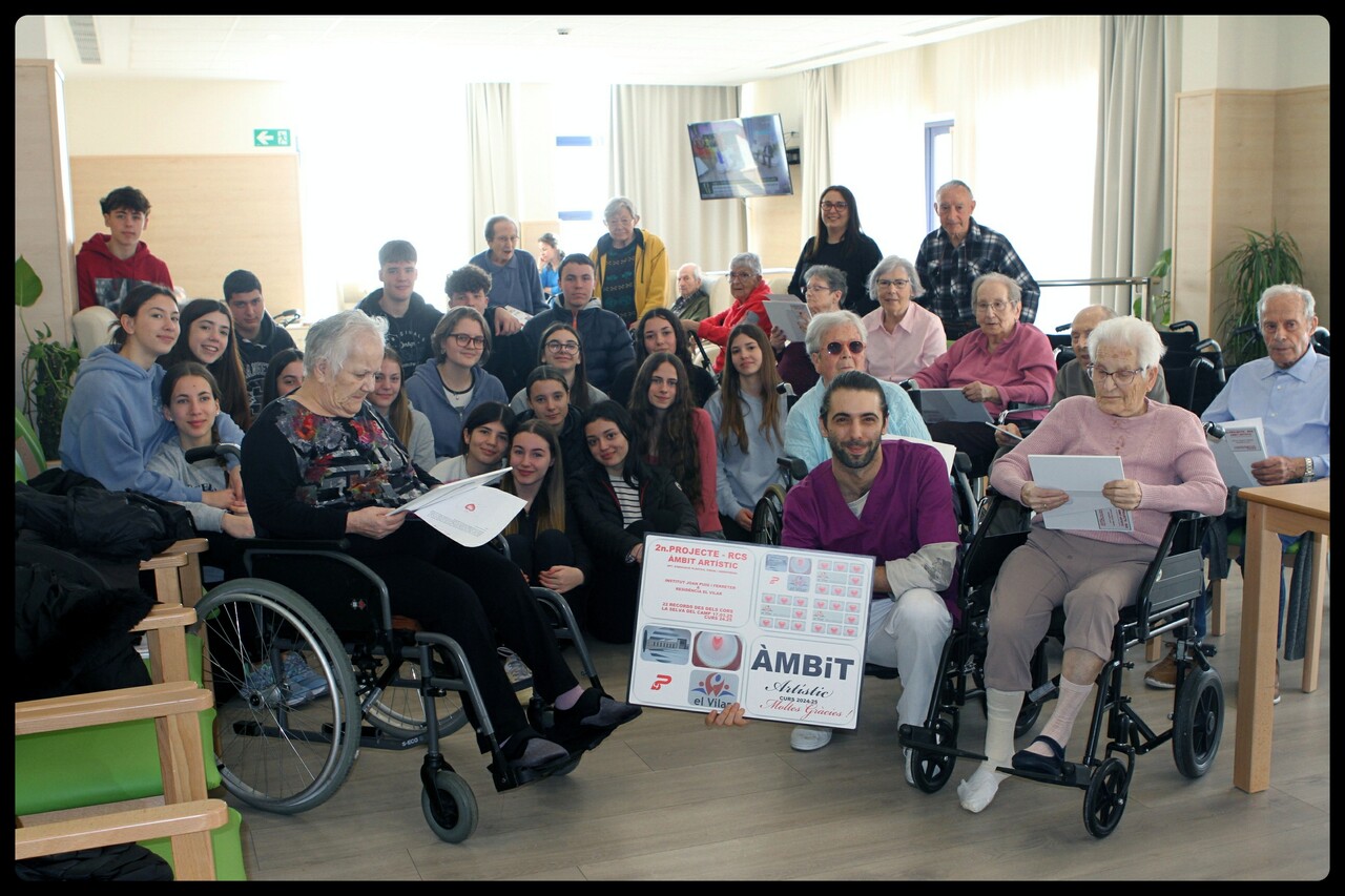 El passat dilluns dia 17.03.2025 els 22 alumnes de 4t. de l’ESO de Projectes de RCS de l’Àmbit Artístic van assistir i entregar els 22 collages més les respectives dedicatòries a els 22 residents d’El Vilar de la Selva del Camp. Aquest curs 2024-25 ja és el Tercer Projecte RCS ” Records des dels Cors ” que col·laborem amb la Residència El Vilar i el Departament d’Educació Plàstica, Visual i Audiovisual. Amb aquest Projecte entre l’Institut Joan Puig i Ferreter i la Residència ” El Vilar ” de la Selva del Camp és … Viure, gaudir, compartir i recordar una vivencia única i irrepetible.