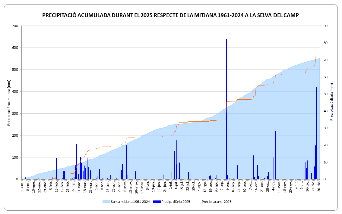 Us presentem el resum de les dades de pluviometria de l’any 2025, comparant-la amb la mitjana dels últims anys, i també un document amb les principals dades de l’any passat.