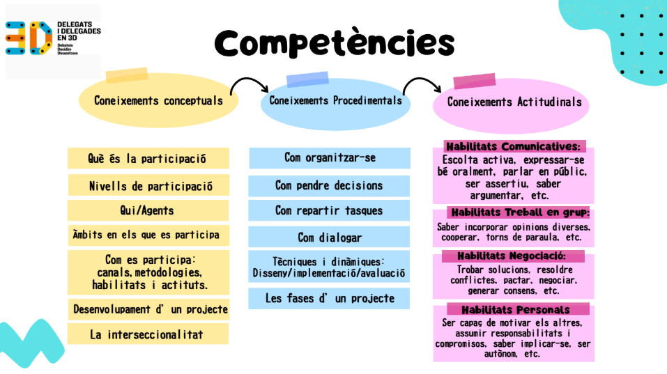 Aquest curs 25-26 participarem del programa Delegats i Delegades en 3D (Debatem, Decidim, Dinamitzem). Aquest, és un programa d’aprenentatge participatiu que combina moments d’assessoraments amb personal expert i part pràctica amb l’elaboració d’un projecte escollit per l’alumnat i implantat de manera participativa.