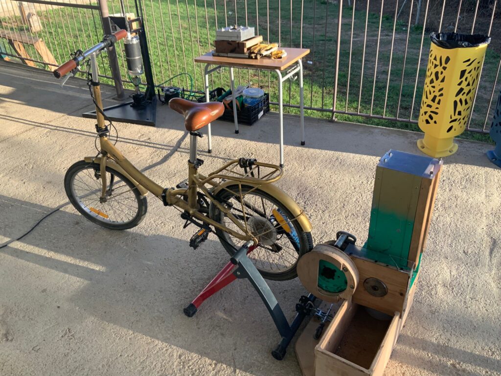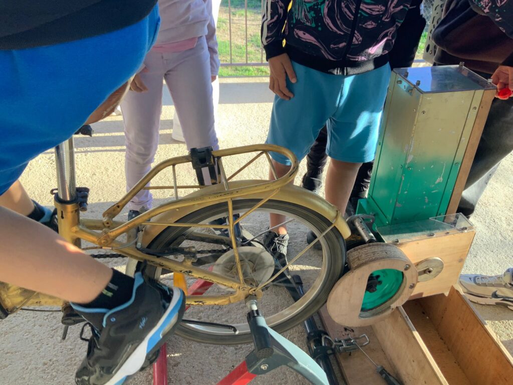 - Trituració amb la bici trituradora: Utilitzant una bicicleta especial, els alumnes fan funcionar una trituradora que redueix el plàstic en trossos petits.