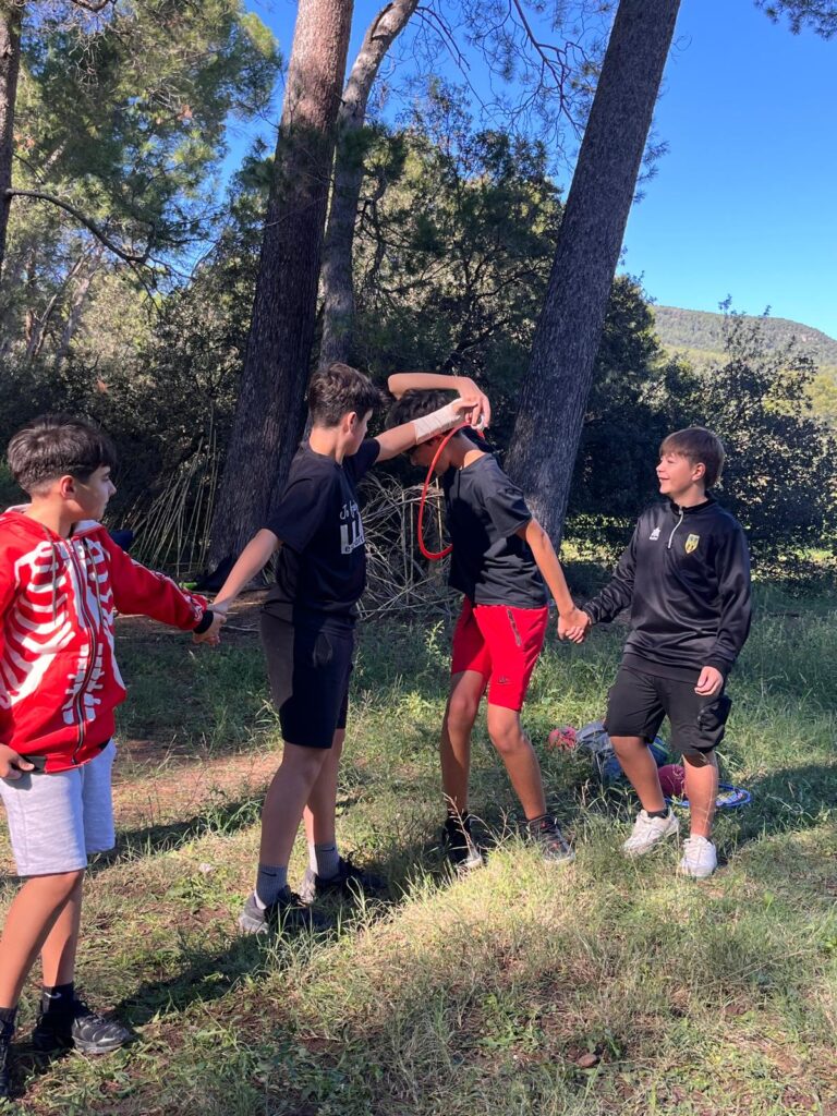 ACTIVITAT DEL NUS HUMÀ: els membres del grup van formar un nus humà en rotllana i un voluntari del grup els havia de donar indicacions per desfer el nus humà i tornar-lo a formar sense deixar-se anar de mans.