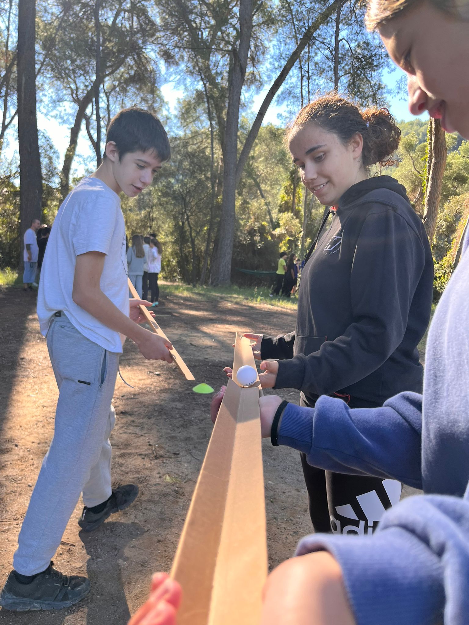 ACTIVITAT DE LA PASSAREL·LA DE CARTRÓ: l’alumnat havia de transportar la pilota de ping-pong mitjançant les passarel·les sense que aquesta caigués a terra. Si queia, el grup havia de començar de nou.