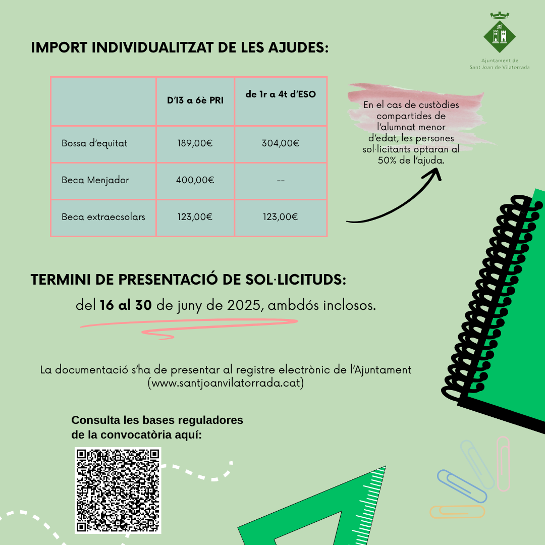 El termini de presentació de sol·licituds és del 16 al 30 de juny del 2025. Trobareu el model de sol·licitud i tota la info al següent enllaç: https://bpm.santjoanvilatorrada.cat/OAC/CdT.jsp