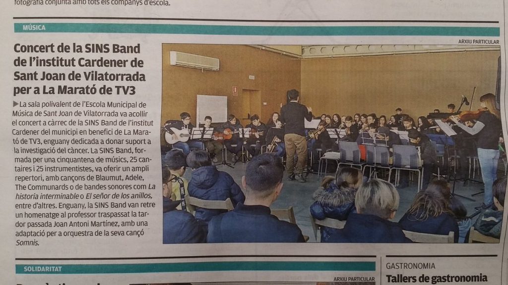 El diari Regió7 es va fer ressò el passat dimarts 26 de març del Concert de la SINS Band en suport de La Marató de TV3 que vam oferir el dissabte 16 de febrer a l’Escola de Música de Sant Joan. La Marató de TV3 enguany era dedicada a la investigació del càncer. Volíem donar-vos les gràcies a tot i totes les que hi vareu col·laborar aportant el vostre granet de sorra, en l’organització del vermut, etc. La recaptació final va ser de 264,97€. Moltes gràcies a tots i totes! Us esperem a la propera!