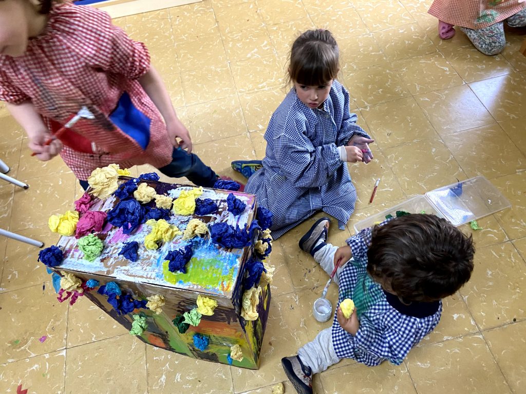 Divendres passat va arribar el Carnestoltes a la nostra escola! Aquest any l’hem fet cooperativament, el grup dels grans es va encarregar de fer el cap, el barret i la cadira reial. El grup dels mitjans les cames i braços, mans i peus. I el grup dels petits van elaborar el cos.