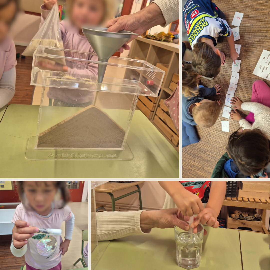 Així doncs, comencem a posar apunt el nostre formiguer seguint les instruccions: afegir sorra fina a la part de baix i humitejar-la, preparar la part superior del formiguer amb pedretes de colors i plantes artificials (que se n’han acabat creant de naturals a través de llavors que han quedat entremig), el menjar, l’aigua i afegir les formigues que trobem en un tub d’assaig al pati. A partir d’aquí ens comencem a fer preguntes sobre les formigues i les anem resolent mica en mica.