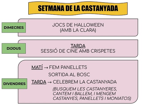 A partir d’aquí, vam haver de posar-nos en contacte amb la Clara d’anglès, l’Ajuntament, Can Jolis, les famílies… per tal d’anar lligant les diferents activitats de la setmana de la castanyada. Aquesta va ser la nostra planificació: