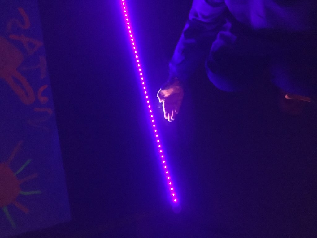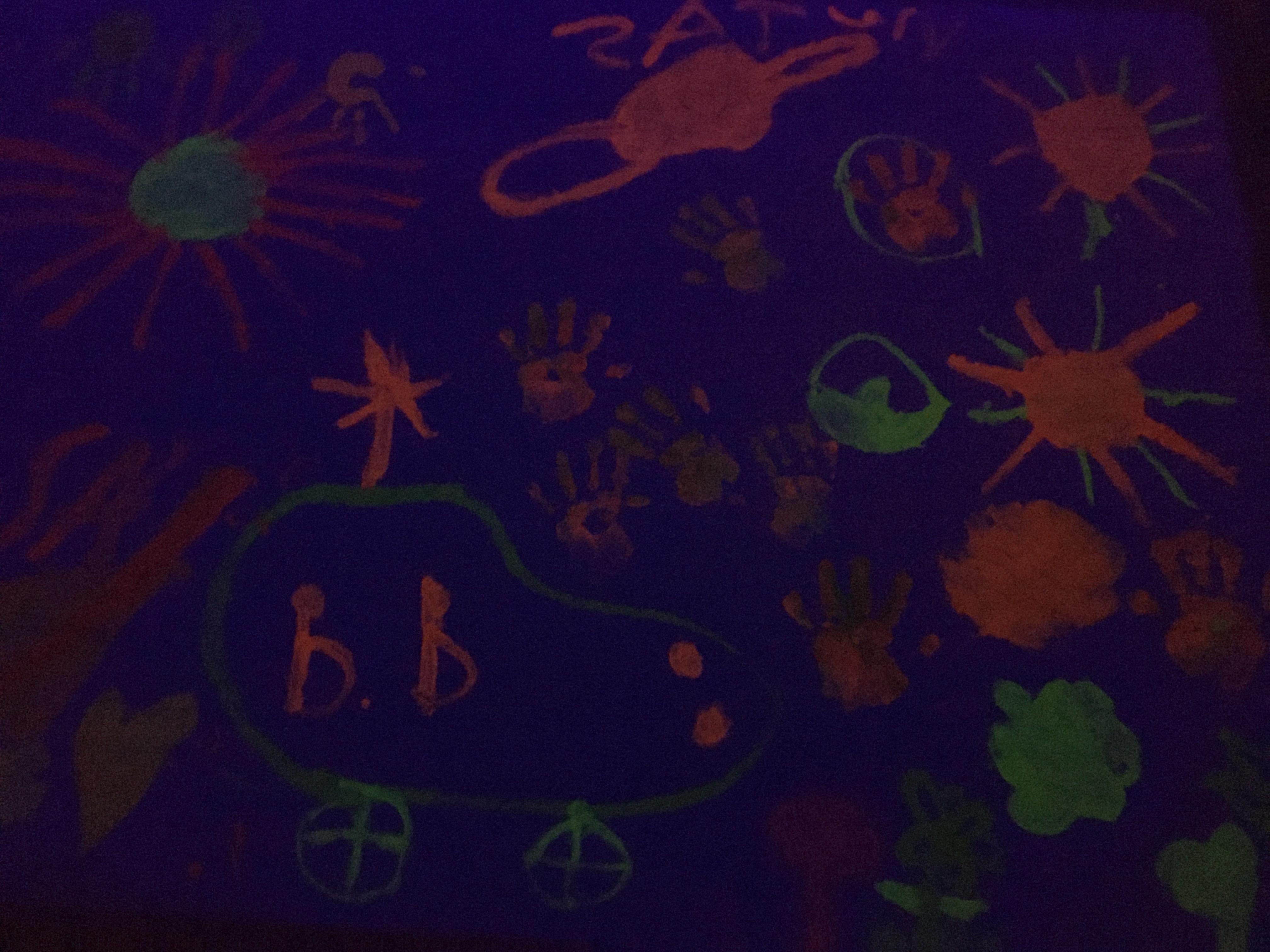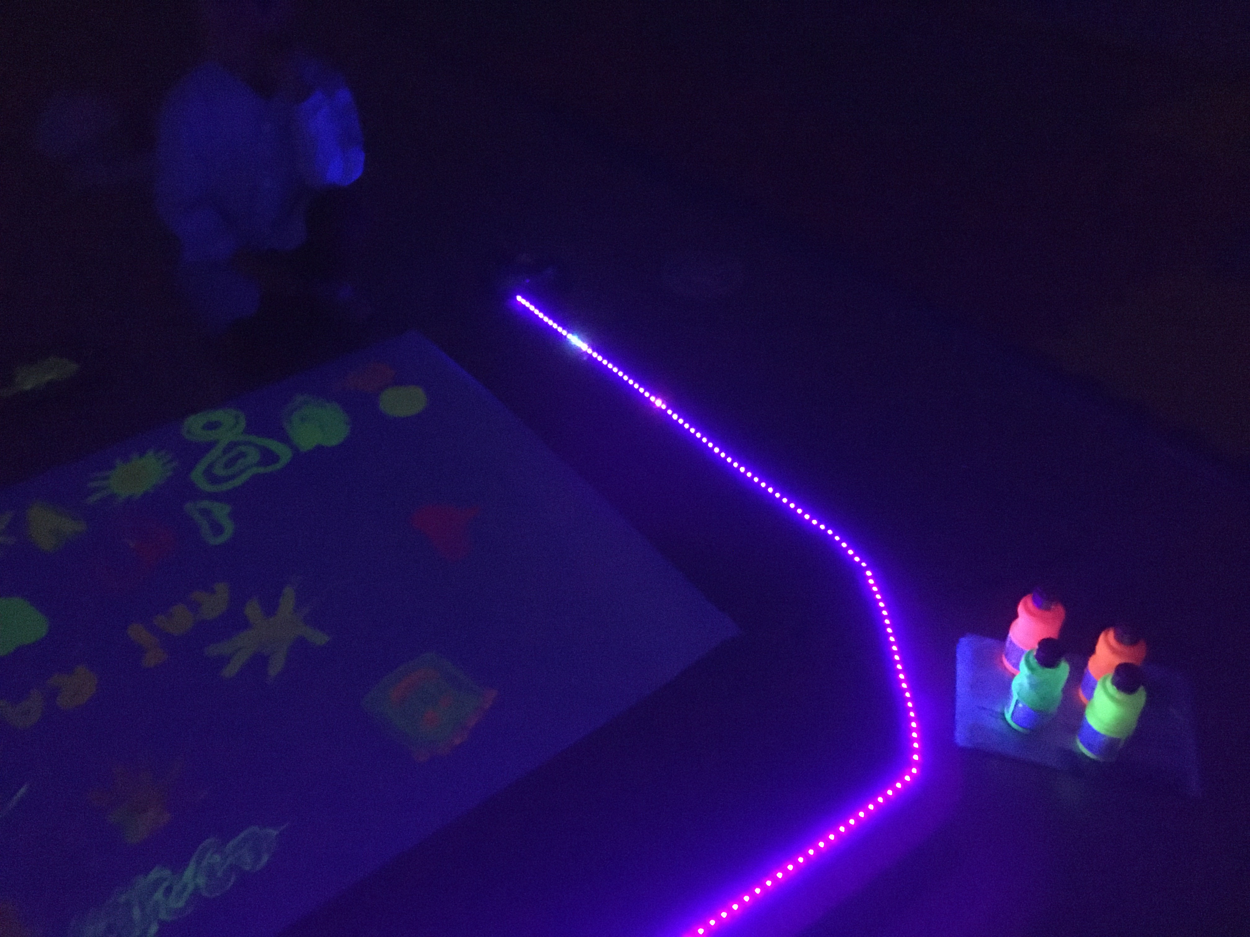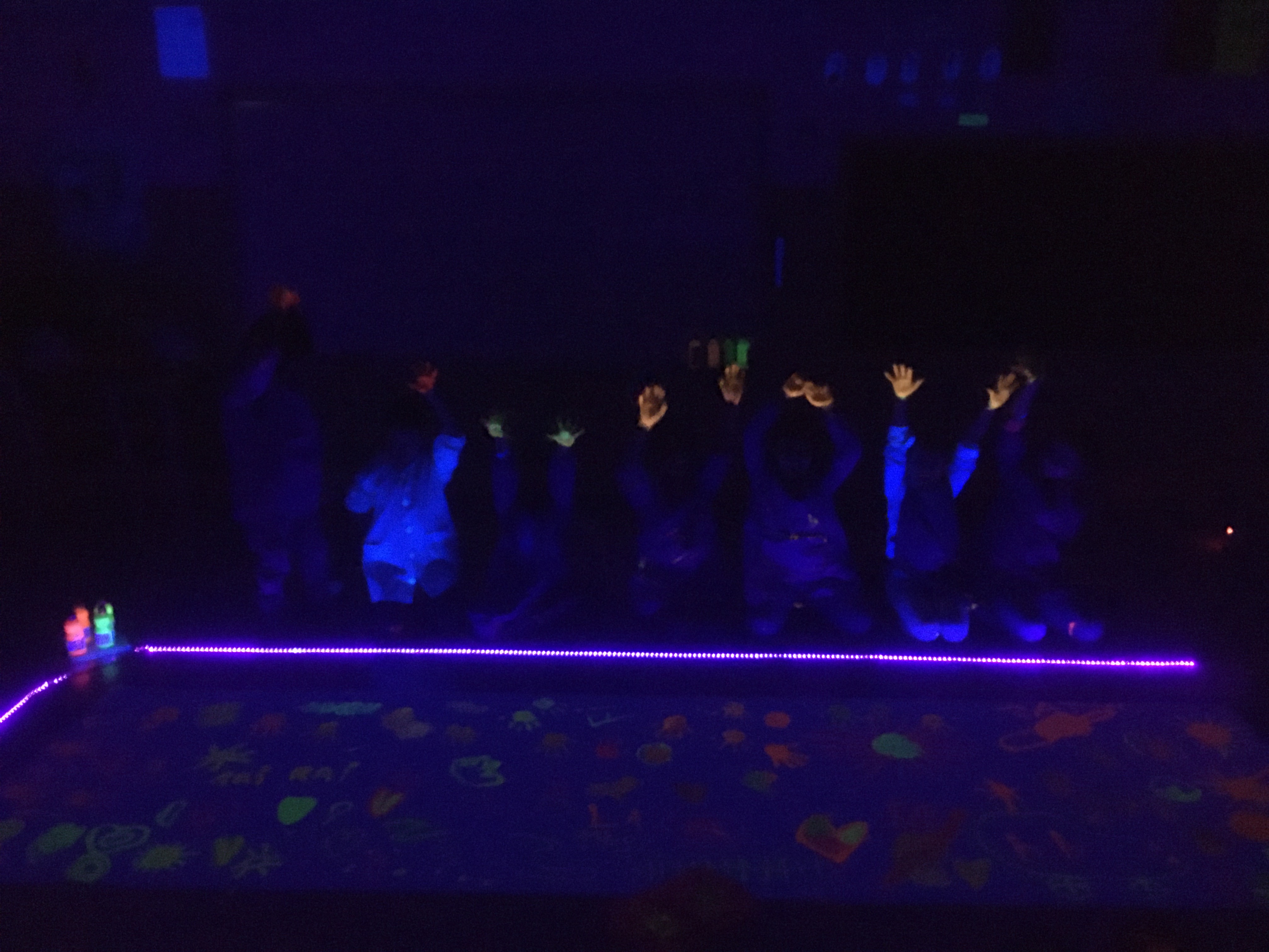 Divendres passat  els nens de cicle inicial vam pintar amb pintura fluorescent i fosforescent.  És una pintura una mica diferent perquè brilla en la foscor. Per a què brilli, necessitem una tira de llum negra i una habitació completament fosca.