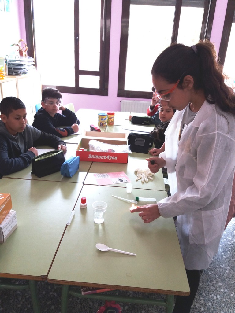 Els alumnes de CS, que ens diem aventurers, ens convertim en aventurers de ciència. Amb ulleres i bata de cientÃfic, aquesta vegada hem treballat mescles i solucions i vam veure com els components à cids i base fan canviar de color una disolució; o què passa si tirem una gota d’una mescla sobre una flama.