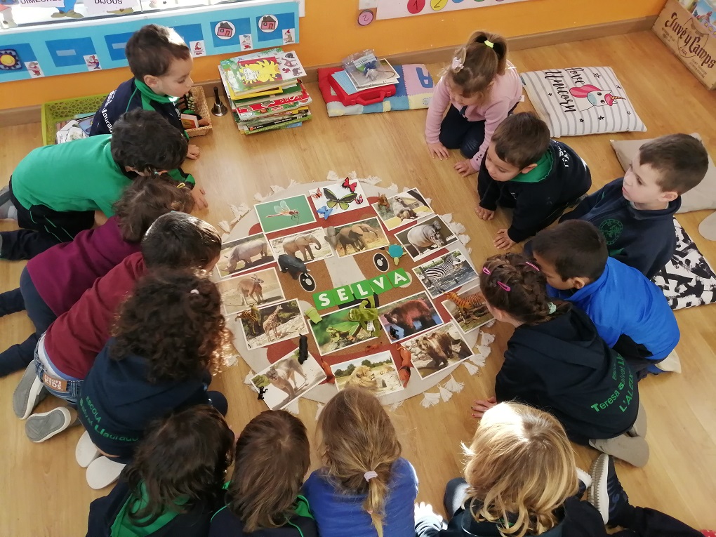 Després d’una primera pluja d’idees, d’on va sortir un ventall amplíssim de possibilitats: tortugues, elefants, gossos, marietes, dracs, flors, ous, cucs, instruments, núvols… El resultat de la votació va ser LA SELVA!