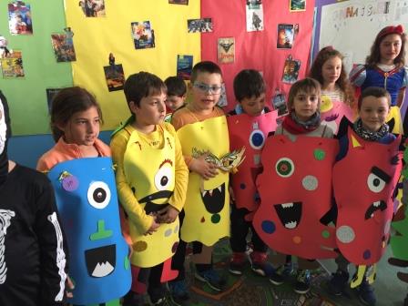 El divendres fem una cavalcada pel barri ensenyant les disfresses i ballant. Les mestres també és disfressen a conjunt, i les famílies de vegades també és disfressen.