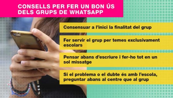 Cal que tinguem en compte, tanmateix, les diferents sensibilitats pel que fa a l’ús de l’smartphone. Per això us volem demanar que en aquests grups deixeu de banda les bromes, les fotos, els comentaris divertits, etc., que serien normals en altres contextos.