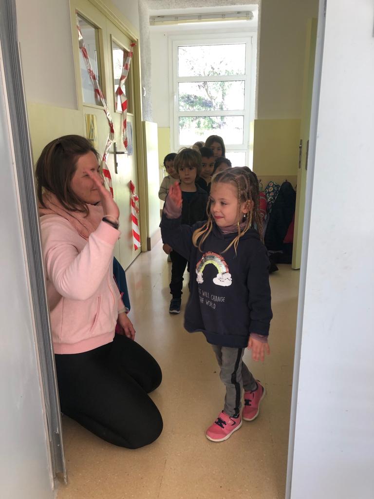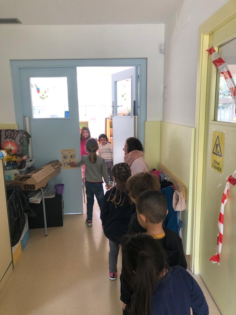 A la porta tenim diferents formes que ens agradaria saludar-nos i cada dia abans d’entrar a l’aula, escollim i toquem la que ens ve més de gust per fer-la amb la mestra. És un moment personal i individual molt bonic que tenim entre mestra i infant i ajuda a fomentar la relació afectiva i social.