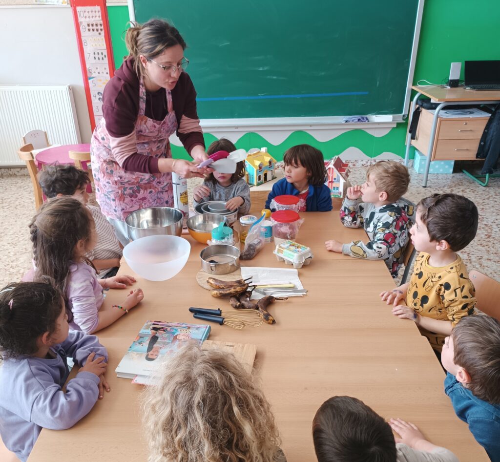 Primer ens vam rentar les mans amb aigua i sabó, després ella ens va explicar com es diu cadascun dels estris que utilitza i ens va mostrar un llibre de cuina de la seva mestra. Ja només faltava posar-se mans a la massa! La recepta escollida va ser un pastís de plàtan. Per fer-lo vam començar pelant i tallant els plàtans. Després els vam aixafar, hi vam afegir els ous, el sucre, la farina, el cacau i el bicarbonat. Un cop tot estava ben barrejat vam preparar els motlles. L’Anna Mar ens va ajudar en tots els passos i es va endur la massa per posar-la al forn a casa seva.