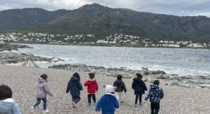 La tramuntana que bufava no els ha deixat continuar l’activitat a la platja i han decidit esmorzar i acabar els jocs del dau de Neptú a l’escola.