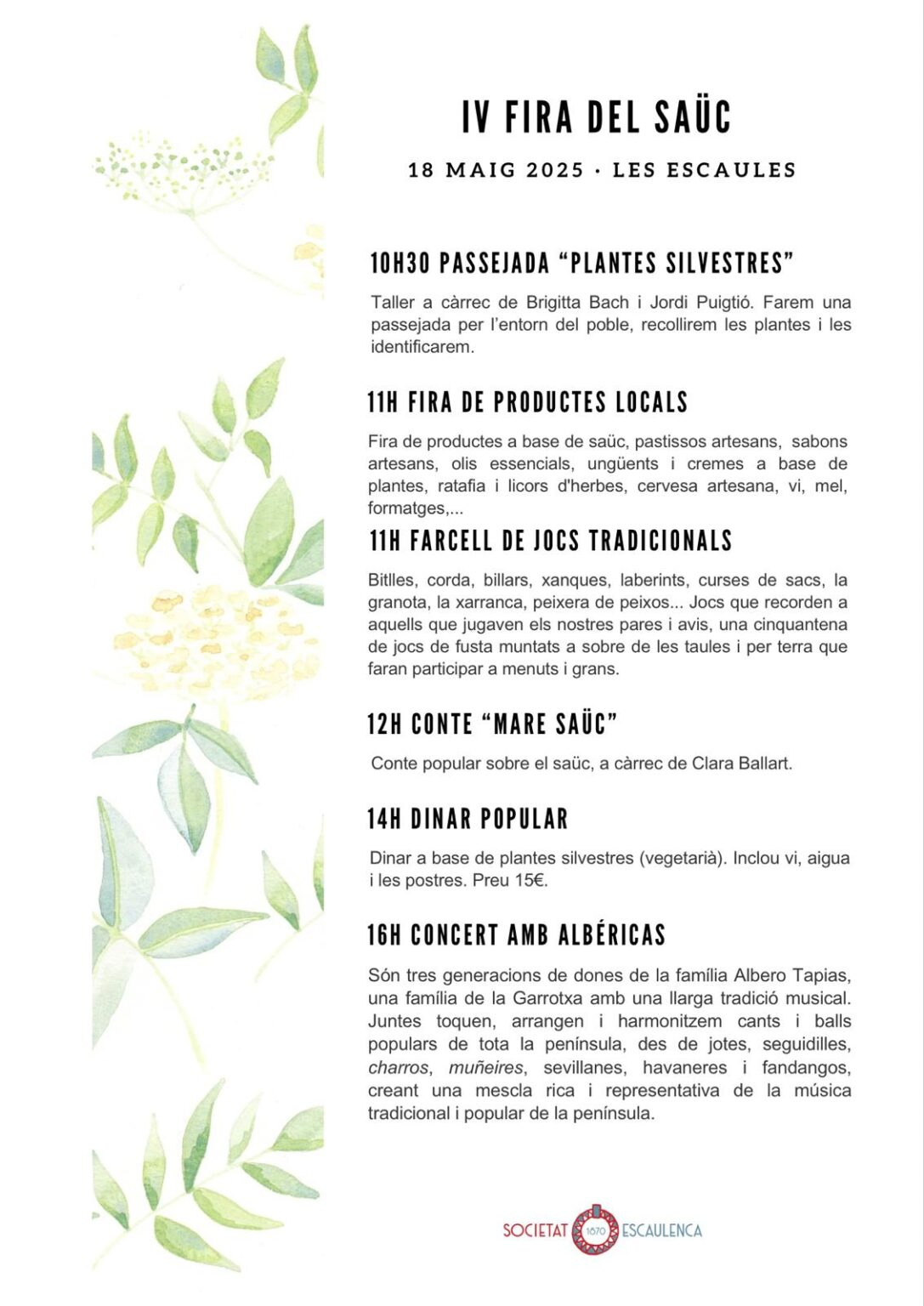 El dia 29 de maig a les Escaules vam gaudir de la Fira del Saüc. Al llarg del dia es van dur a terme diferents activitats com una mostra de productes locals, una exposició de jocs tradicionals, l’explicació d’un conte mitològic, un dinar popular i un concert.