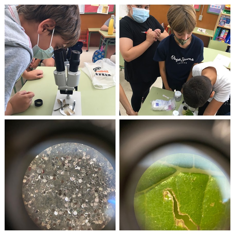 - Treball amb el microscopi: Cadascú de la classe havia de triar i fer la hipòtesi del què creu que observarà amb el microscopi, entre les opcions hi havia: brutícia d’on surt aigua aixeta, bombolles de coca-cola o bicarbonat amb vinagre, fang del carrer, purpurina, tovalloleta, plantes, un dibuix del mòbil, fregall de netejar plats (net i brut), una tireta, un paper trencat… i un triat pel propi alumne.
