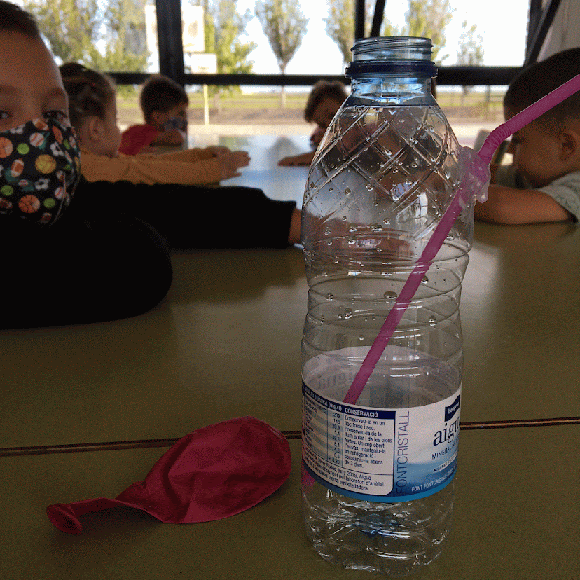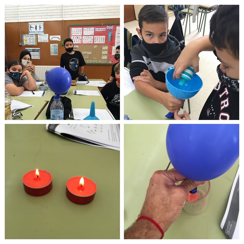 L’experiment va consistir en apagar espelmes sense tocar-les i inflar un globus amb el gas que es produeix al barrejar el vinagre amb el bicarbonat (CO2). El procés per fer-ho va ser molt interessant. Vam descobrir que el CO2 és més dens que la resta de gasos de l’atmosfera, per això s’apaga el foc de les espelmes quan l’aproximem.