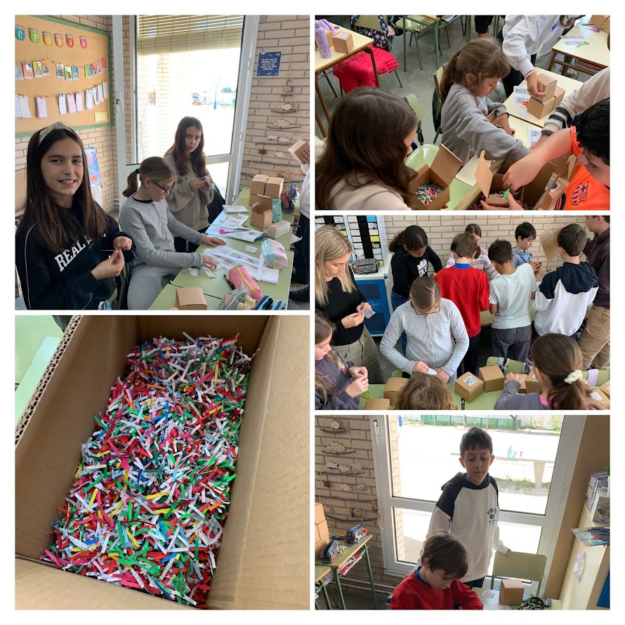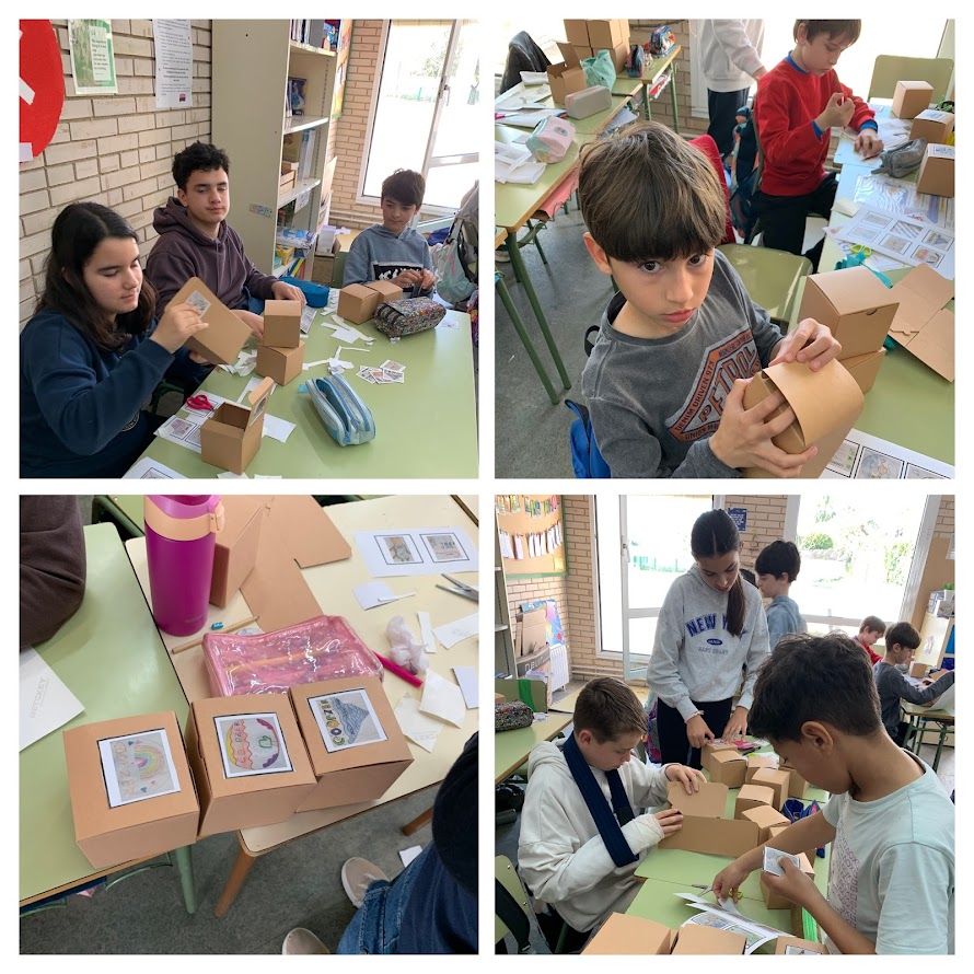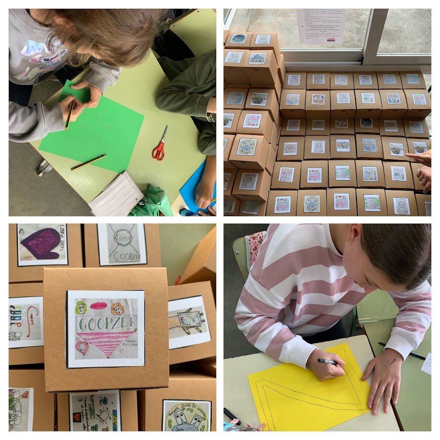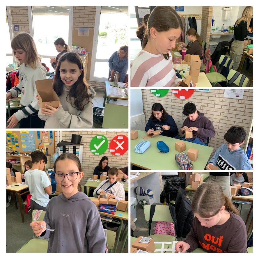 A continuació, ens vam organitzar per acabar i empaquetar el producte final: la manyopla reciclada. Ens vam repartir les tasques de manera col·laborativa: alguns alumnes muntaven les caixes, altres enganxaven els logotips, uns altres col·locaven les manyoples a l’interior i la resta hi afegien encenalls de colors per fer el producte més atractiu i cuidat.