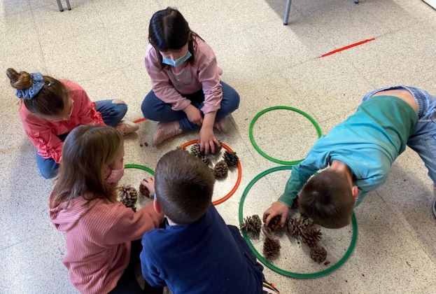 Dins de l’àrea de Matemàtiques, els alumnes de CI hem començat a treballar els conceptes de meitat, doble i triple. Després de l’explicació i de fer fitxes per treballar aquests conceptes ha vingut el moment d’aplicar-los de forma divertida. La Miriam, la nostra practicant, ha preparat un joc amb pinyes i cercles. Aquest joc ha consistit a ficar dins dels cercles el nombre de pinyes que corresponien al doble, meitat o triple del nombre que la Míriam ha dit.
