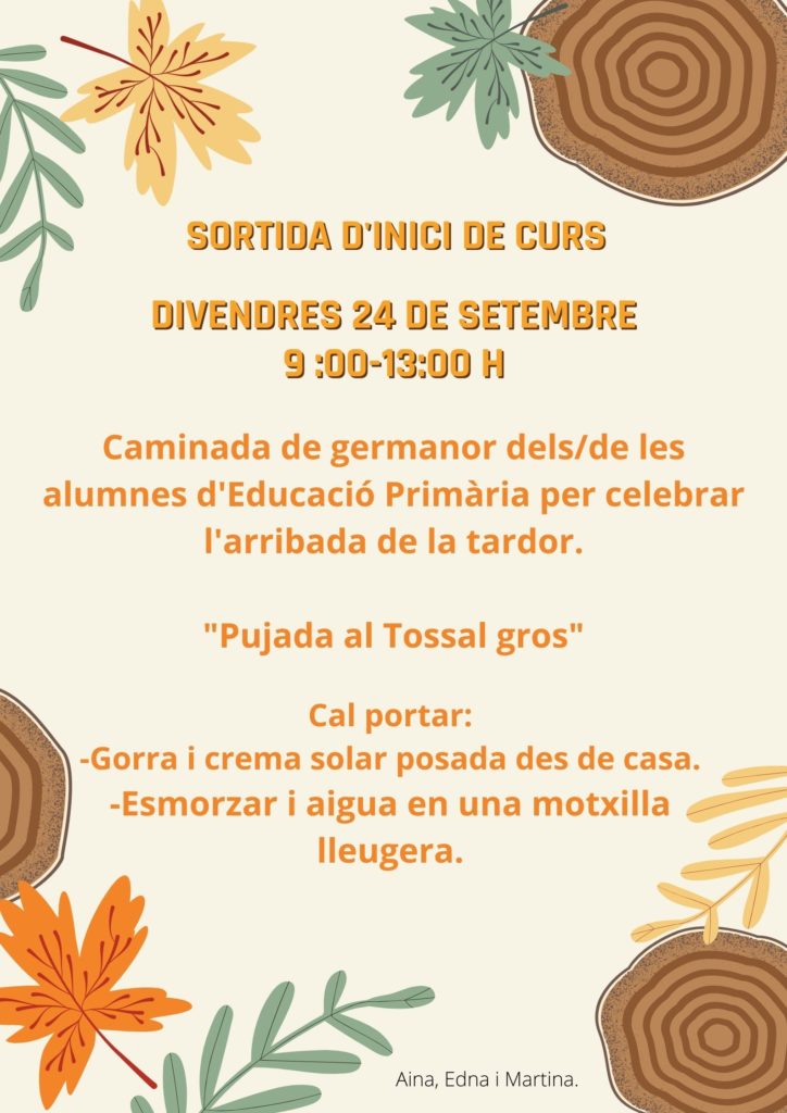 El proper divendres 24 de setembre, els i les alumnes d’Educació Primària de l’escola Abat Ruera i els/les docents, sortirem a fer la tradicional sortida de principi de curs amb l’objectiu d’agermanar-nos i, alhora, donar la benvinguda a la tardor.