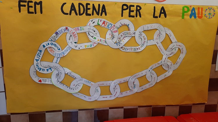Per elaborar el mural, hem confegit una cadena en la qual cada nen i cada nena havia d’escriure, en una baula, un favor o una bona acció envers un company o companya de l’escola, des del més petit al més gran.