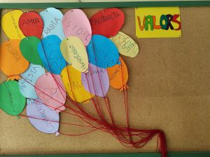 El primer contacte amb l’àrea de Valors i Religió ha estat fer un recordatori de tots aquells valors que es van treballar el curs passat i plasmar-los en un mural. Aquest mural està al costat de la porta. Això permet als alumnes anar recordant els valors durant les entrades i sortides.