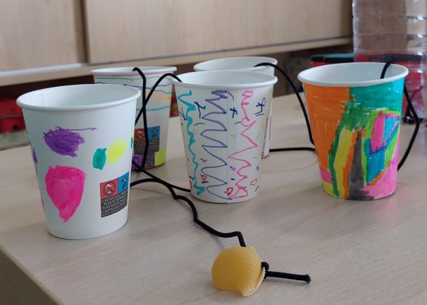 Després de les vacances de Nadal vam construir una joguina: un joc d’habilitat decorant vasos de cartró amb retoladors i afegint un pes lligat a una gometa per intentar encistellar dins del vas. Va ser molt difícil!