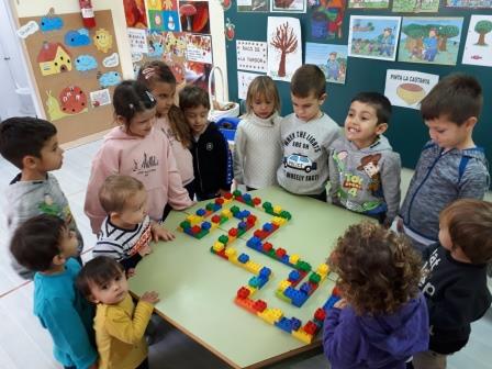 En una primera sessió vam bufar pilotetes de tennis-taula (cadascú la seva) a través d’un laberint fet amb peces de construcció i, en una segona, l’itinerari a seguir el van construir els /les propis/pròpies alumnes amb plastilina i van bufar-les amb una canyeta.