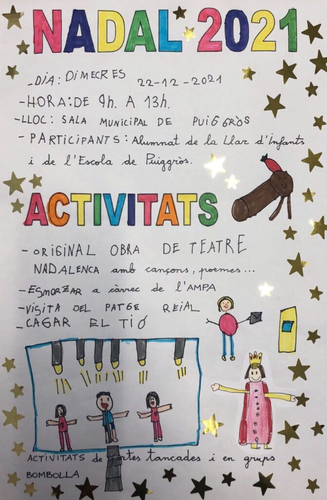 Nadal a l’escola Abat Ruera admin17/12/21 Mireu quin cartell tan bonic ens han fet les nenes i els nens d’Educació Infanti!!! I sobretot, mireu quines activitats!!! Gràcies AMPA per ajudar-nos tant!