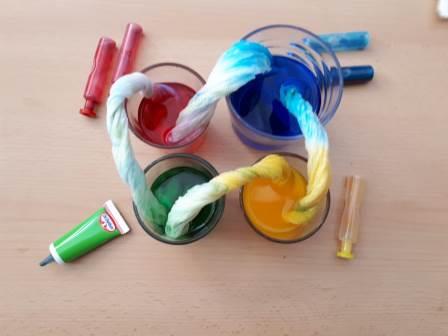 – Activitat: posem un bocí de paper de cuina caragolat amb una punta a cada vaset amb aigua tenyida de color. Ho fem amb tots els vasets que tenim i observem què passa.