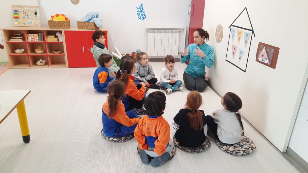 Aquest matí, la Laura, la mare de l’Elisenda ha vingut a l’escola a explicar-nos com és dia de feina a la llar d’infants. Ens ha explicat com fan les rutines, com els canvia els bolquers i ens ha fet una proposta d’activitats com les que fa amb els seus nens i nenes. També ens ha explicat que al migdia fa de monitora de menjador de nens i nenes amb discapacitat.