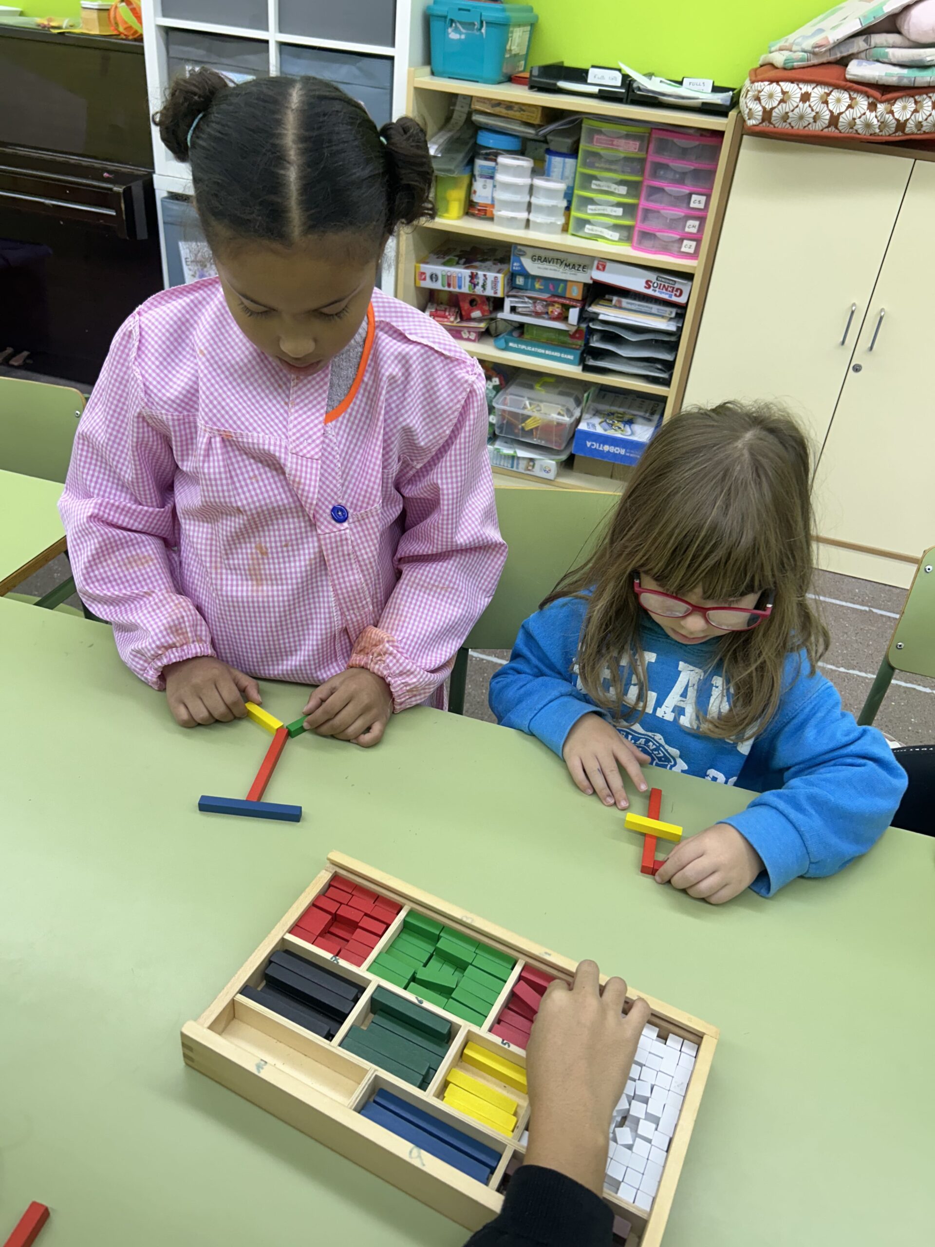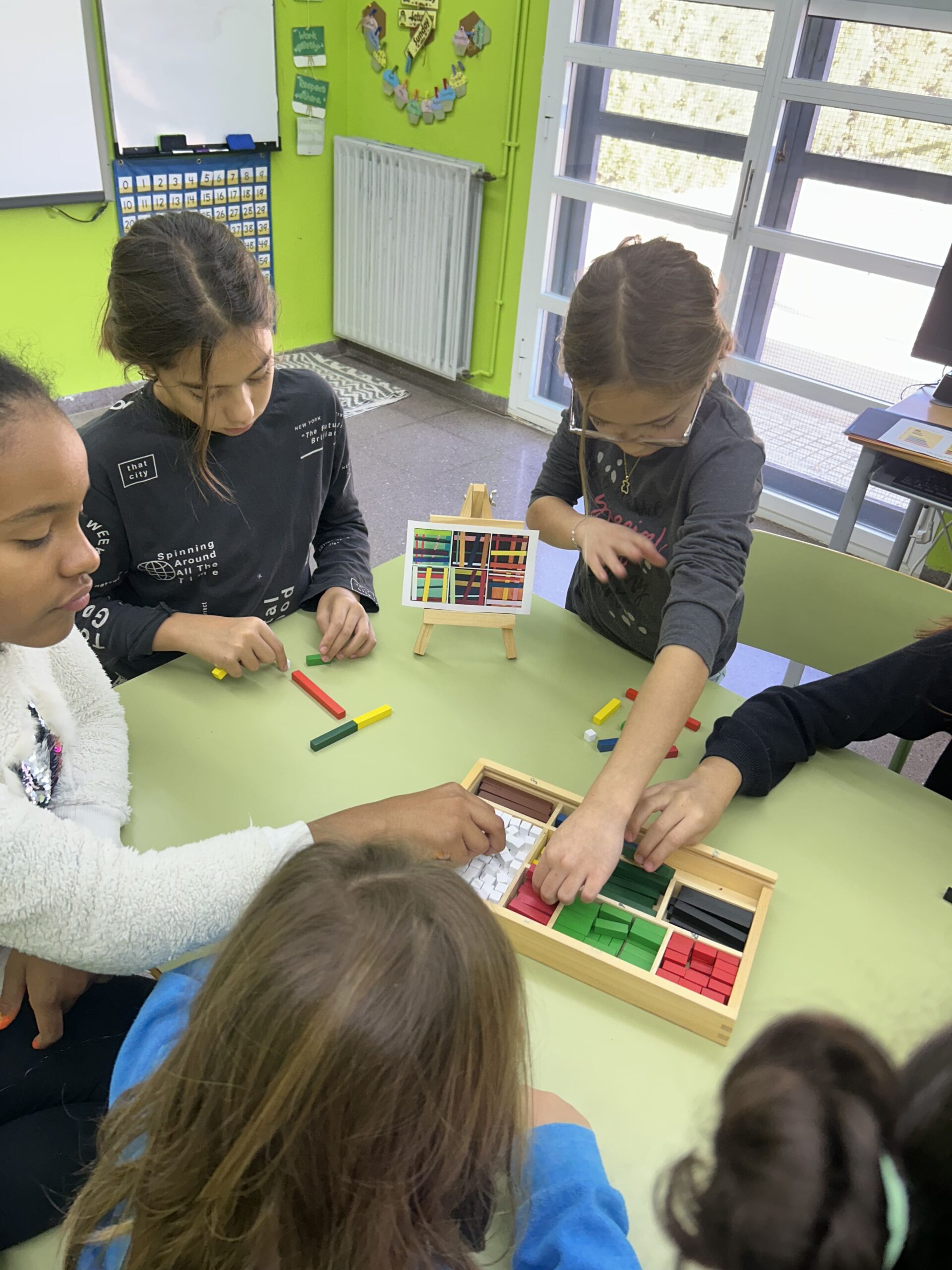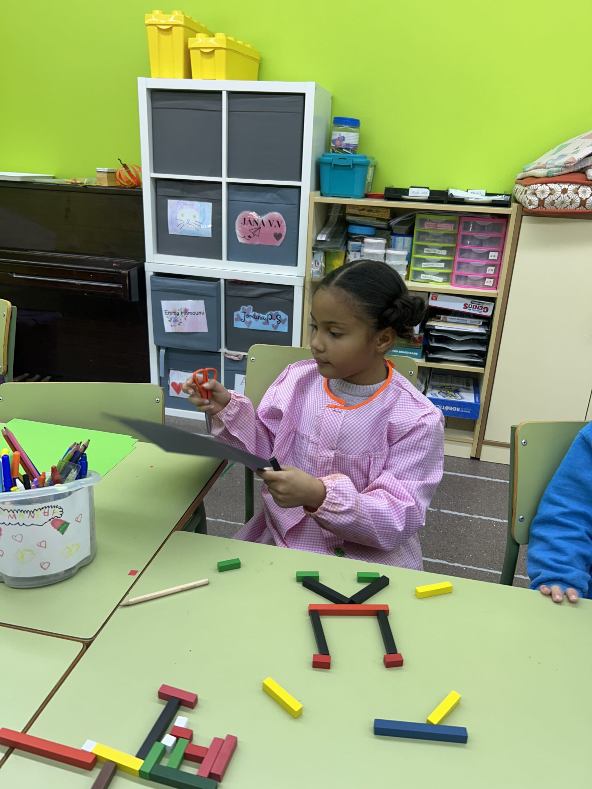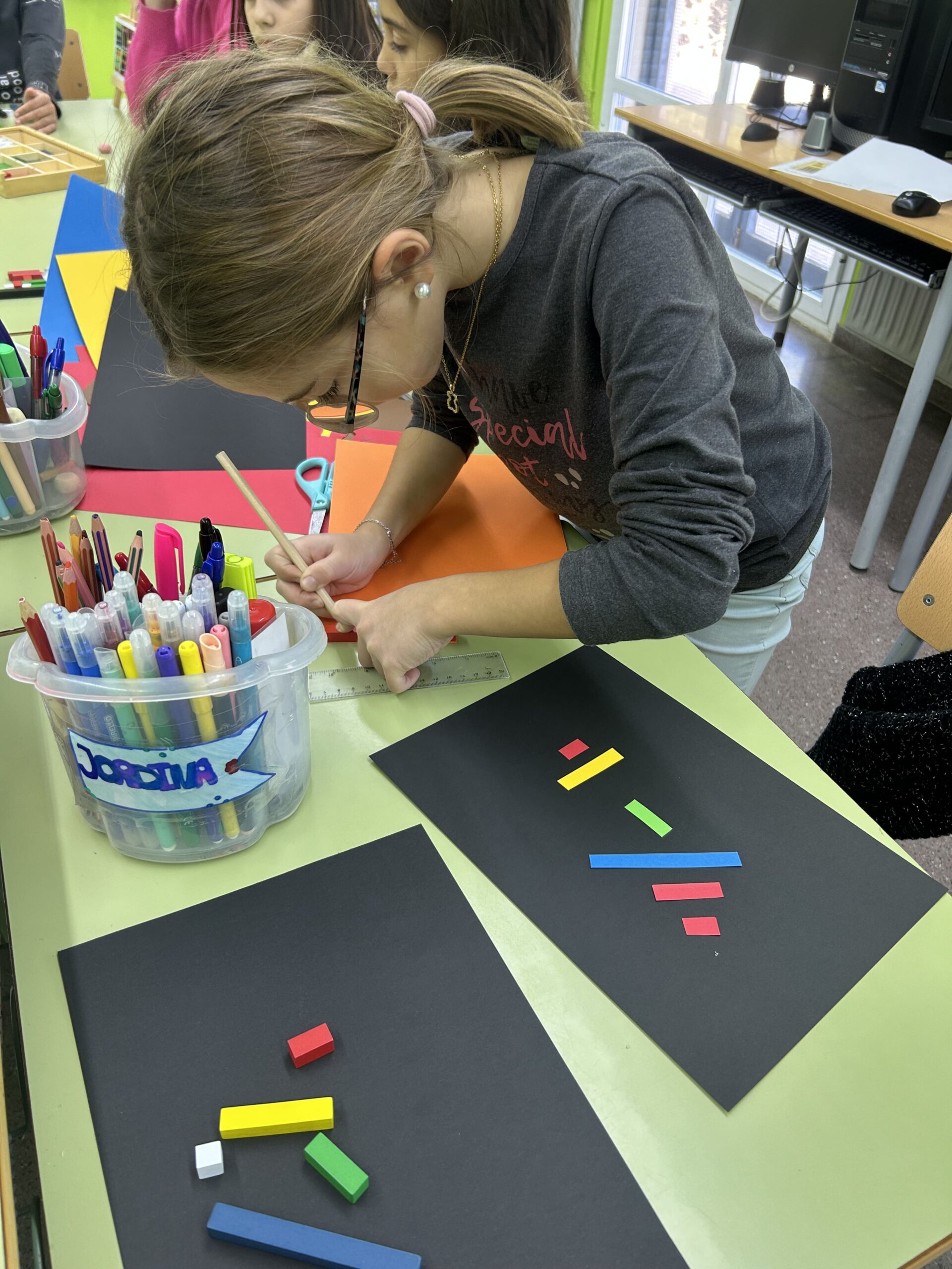 Les alumnes d’educació primària han treballat l’artista alemany Imi Knoebel, conegut per les seues formes geomètriques i colors vius. Després d’observar la seua obra, l’alumnat va rebre un repte: crear una composició inspirada en el seu estil i calcular-ne el valor total en centímetres.