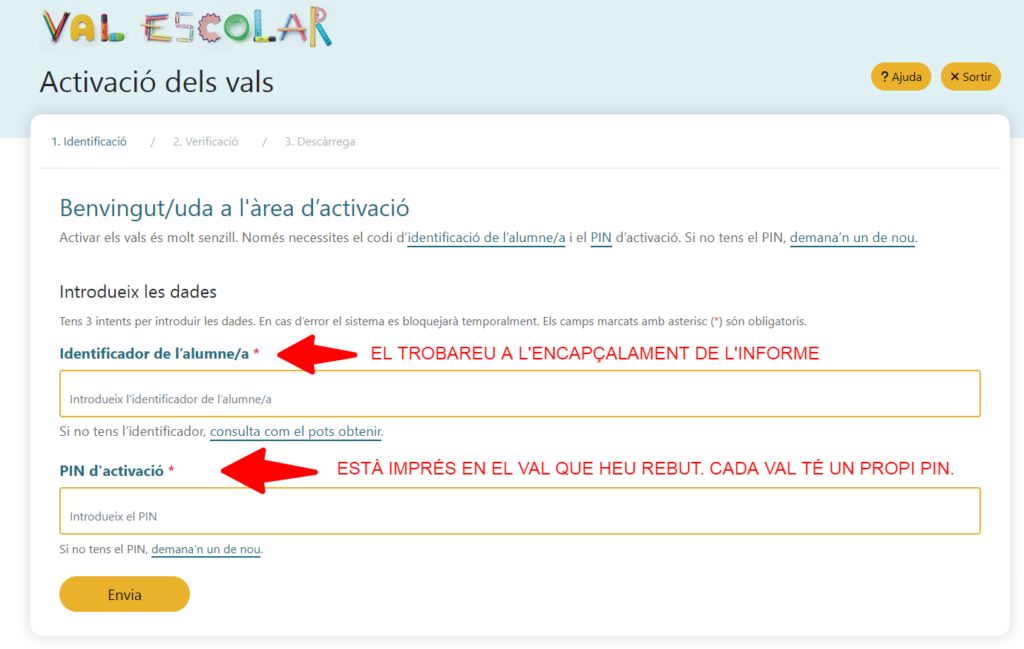 2. Introduir l’identificador de l’alumne/a i el PIN que hi ha als vals