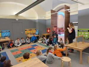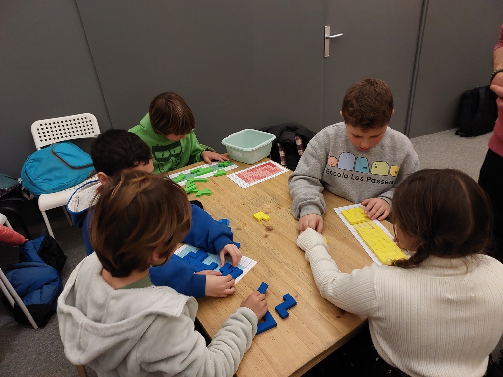 Els primers a començar van ser els alumnes de 3r i 4t amb la visita guiada pel Museu i fent tot seguit el taller “Construïm poliminós”. En aquest van estar treballant amb peces de modulmax i amb pentominós de goma-eva per tal de reconèixer simetries i girs i també calcular i relacionar figures amb la mateixa àrea i diferents formes.