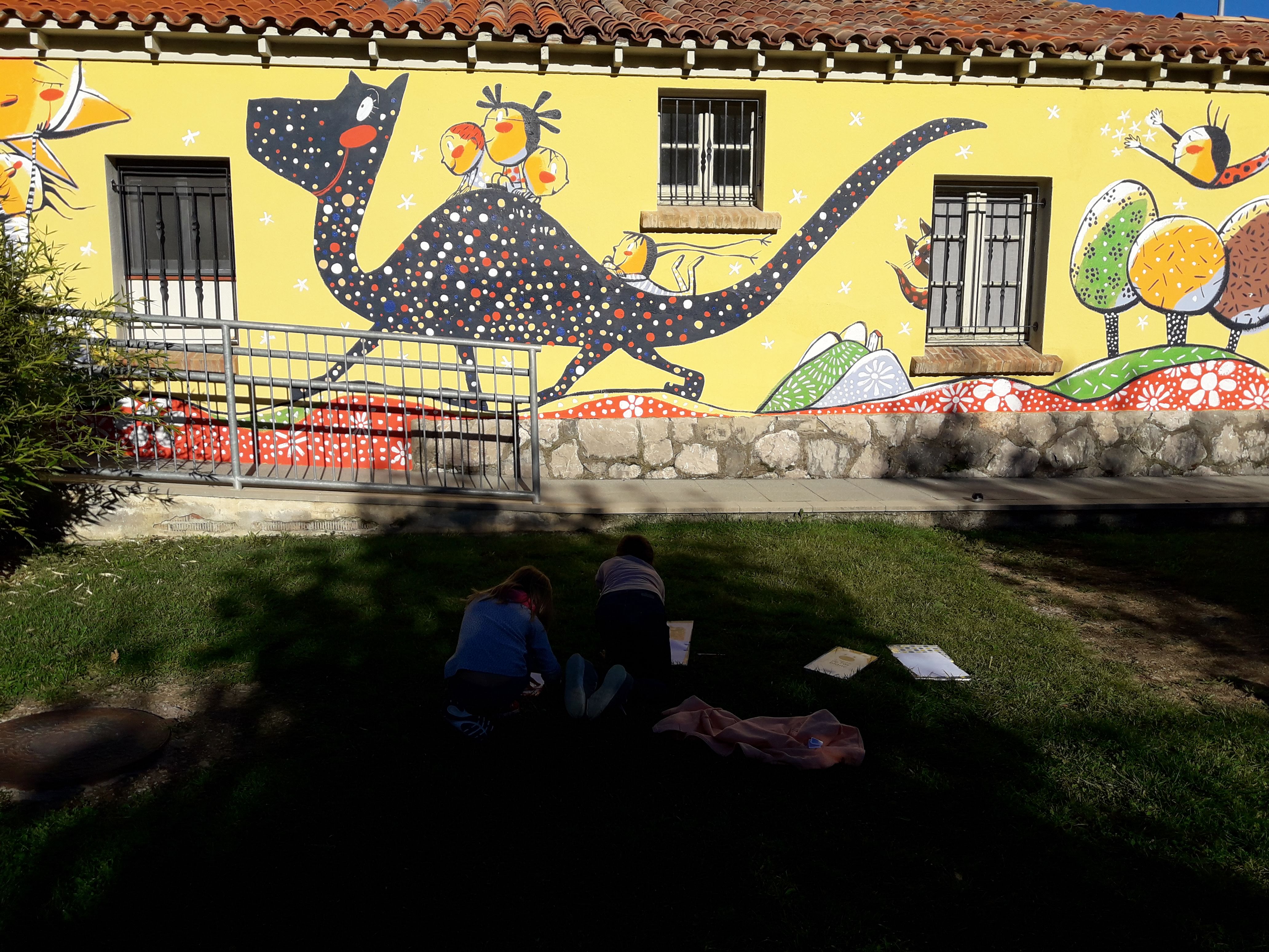 Fa uns cursos, malgrat disposar d’un pati exterior molt gran i amb espais variats, teníem la necessitat de fer-lo més atractiu i que l’alumnat se’l sentís més seu. Així que ens vam posar en contacte amb l’il·lustrador Valentí Gubianas perquè ens dissenyés el mural d’una de les parets de l’escola. Volíem que en el disseny hi participés l’alumnat. Vam fer una assemblea i vam posar en comú les idees que tenien. Va sortir un llistat amb tot de coses molt característiques del seu poble i del seu entorn, com per exemple: el campanar de Vallcebre, un dinosaure i les petjades (les quals es troben a pocs quilòmetres del poble), muntanyes properes com el Pedraforca, Ensija o el Cadí Moixeró, flors, neu i evidentment, no hi podien faltar nens i nenes, algun enfilat sobre el campanar intentant tocar la lluna, altres sobre el dinosaures, etc.