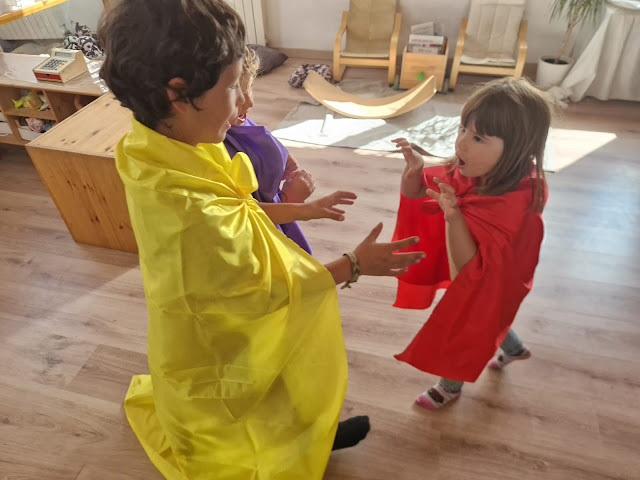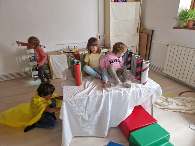 Els petits gaudeixen de sessions d’expressió corporal. En aquesta ocasió hem creat un espai que fa que es desperti la seva imaginació d’una manera màgica. Es converteixen en tots aquells personatges que imaginen i s’inventen les més insòlites històries. Es maquillen, es disfressen i són dracs, zombis, superherois…